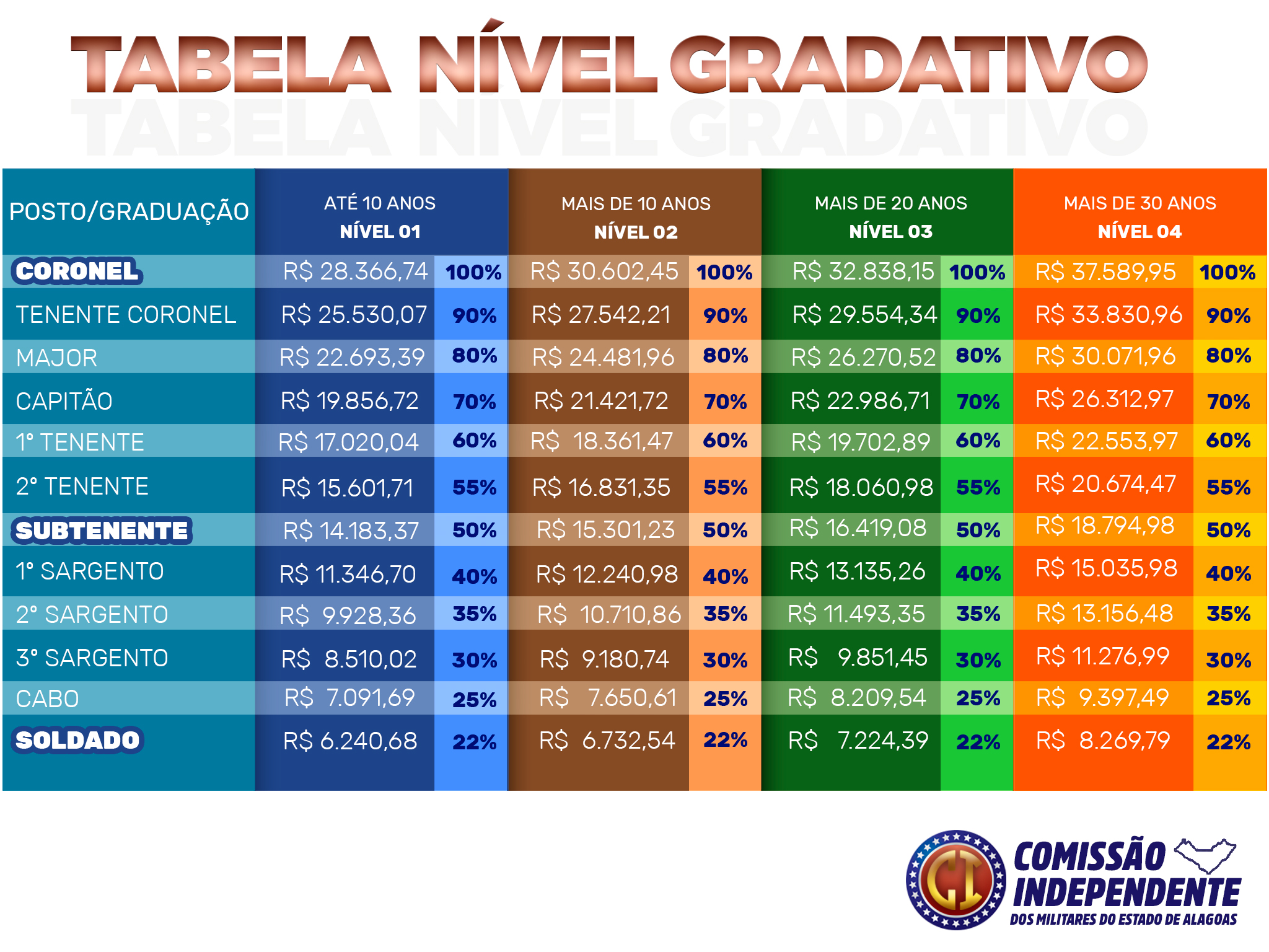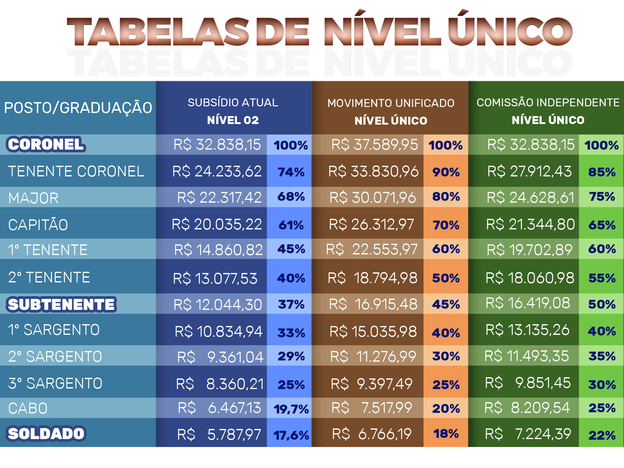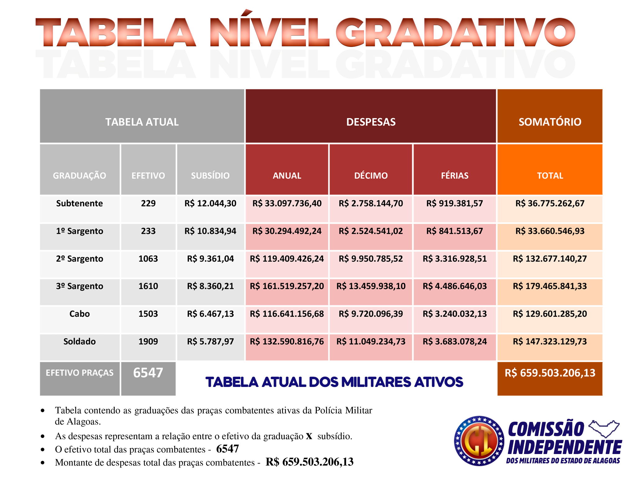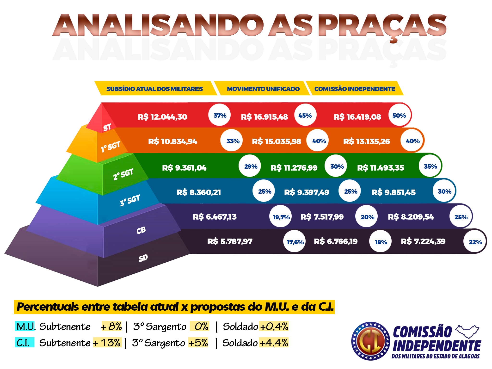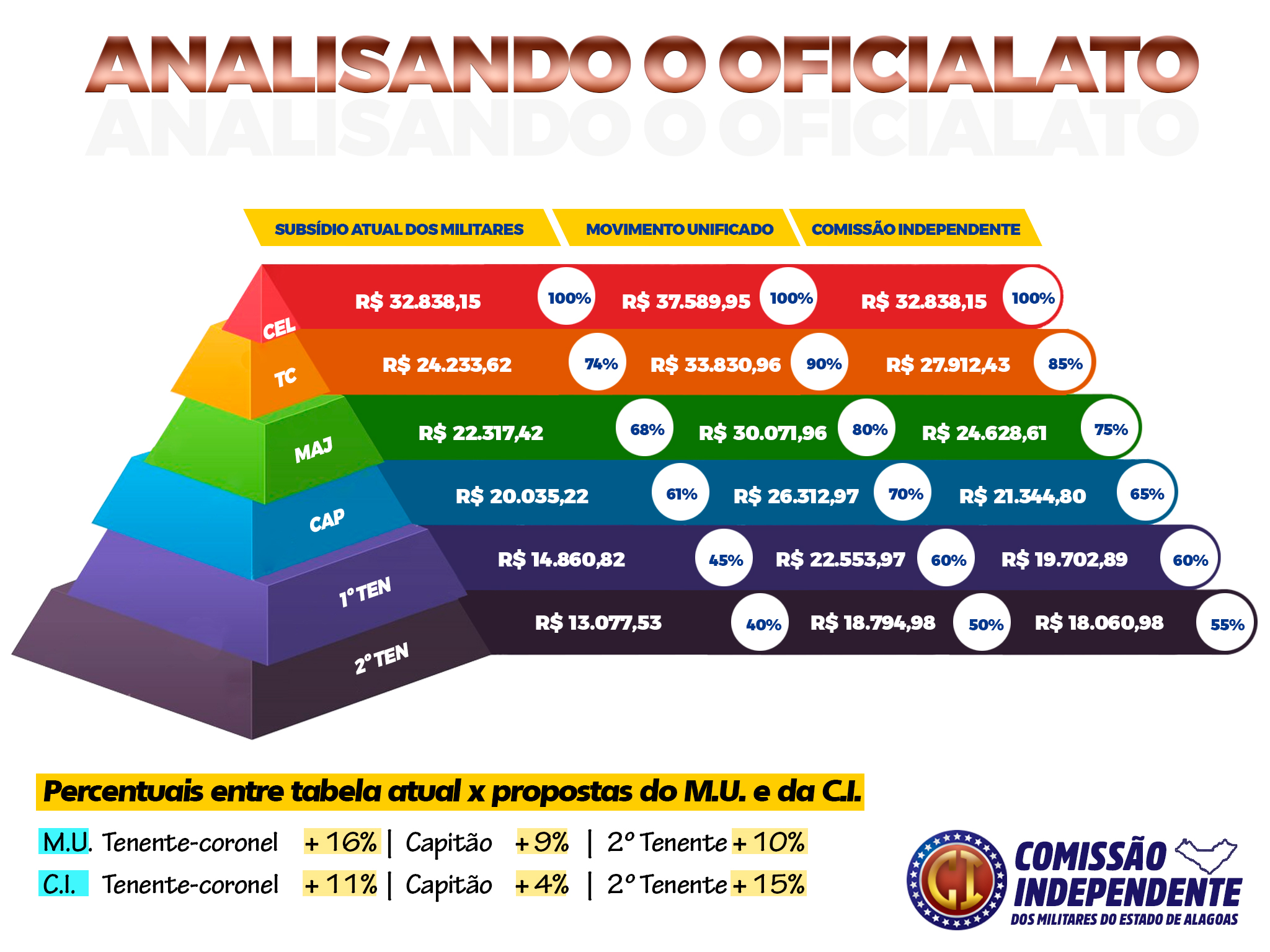 Nessa apresentação mostramos um comparativo entre as tabelas atual dos Militares de Alagoas, a proposta do Movimento Unificado e a proposta da Comissão Independente.